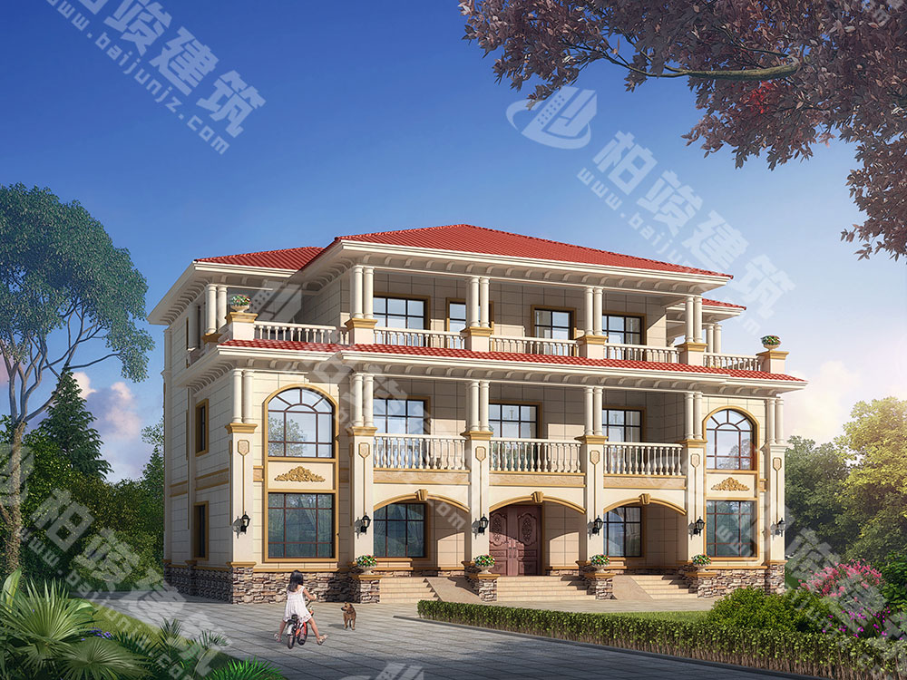 屋顶造型:坡屋顶设计,多个立面高低起伏,错落有致;红色釉面瓷瓦色泽鲜丽,经久耐用