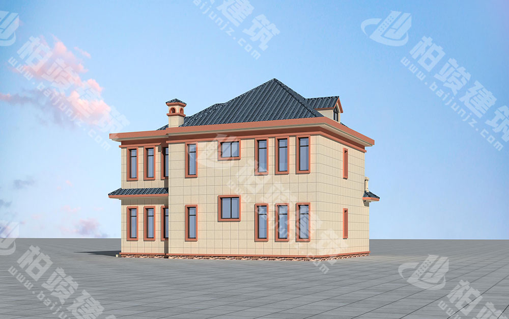 屋顶造型:平坡结合,灰蓝色瓦片铺设错落坡顶,平顶处可放置水箱,美观实用兼而有之